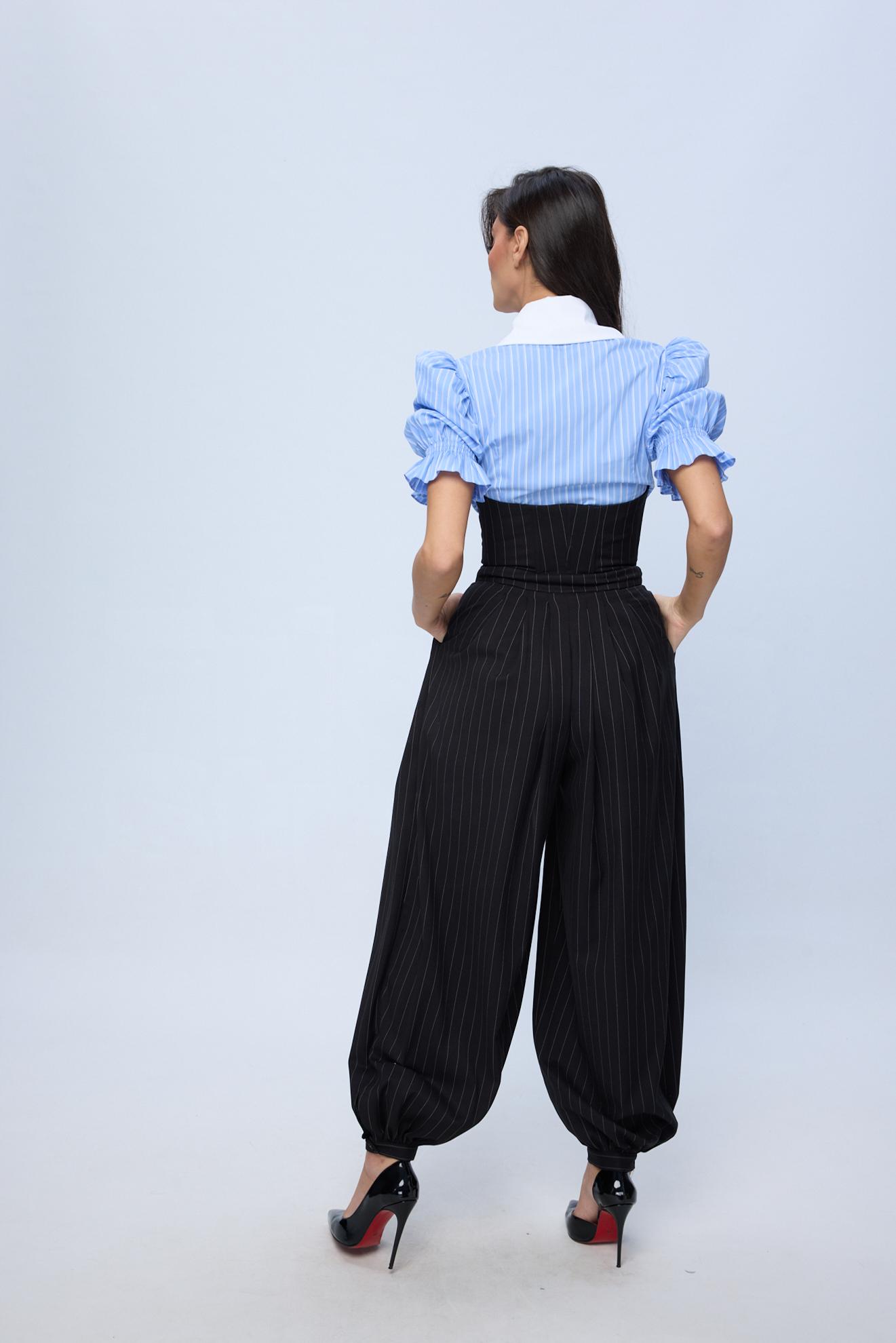 Design: Mâneci bufante cu detalii elastice, guler contrastant și branding SITARA.